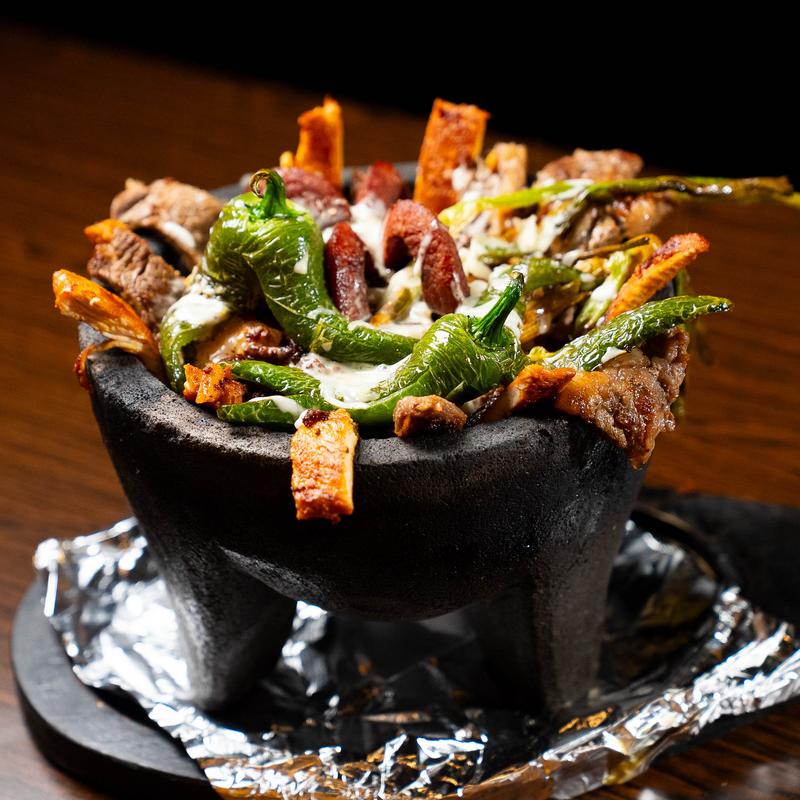 A combination of grilled chicken, rib-eye steak, shrimp, chorizo, and grilled onions | Served in a hot volcanic stone bowl | Topped with two jalapeño poppers, our special sauce, and shredded cheese.