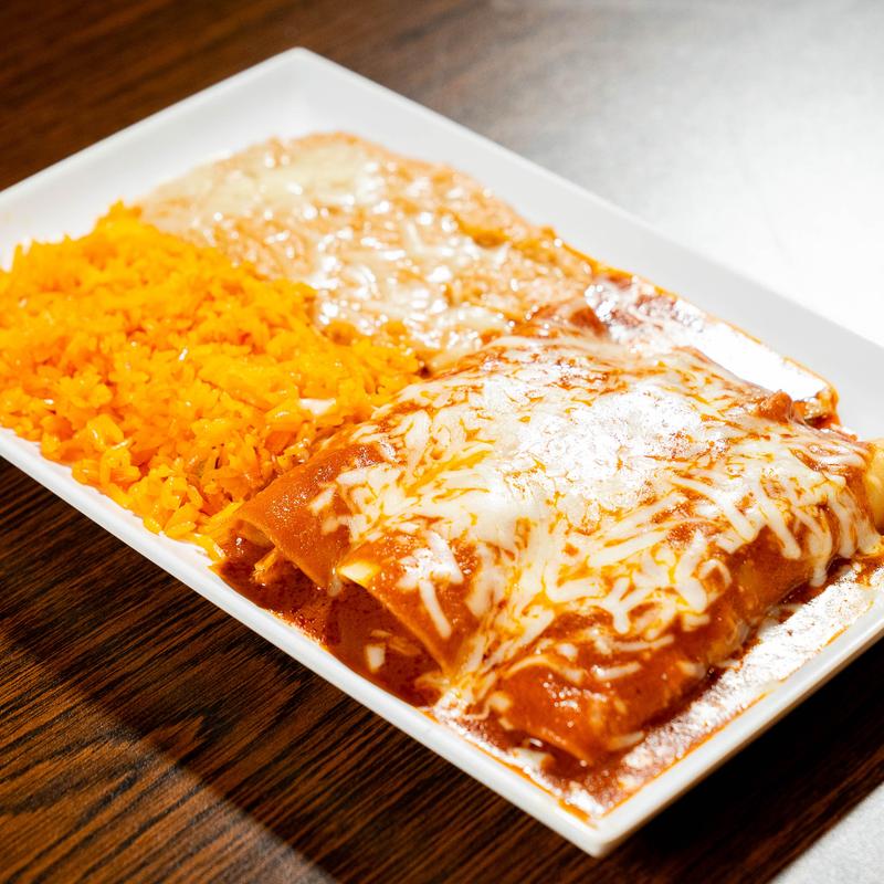 Three ground beef or shredded chicken enchiladas in a red salsa | Served with rice and beans.
