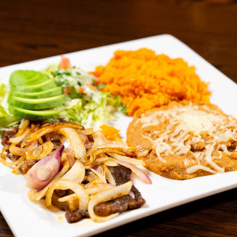 Grilled pork cooked with onions | Served with rice, beans, salad, and tortillas.