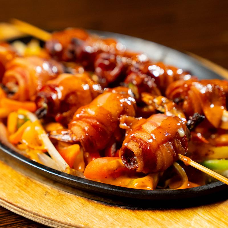 Skewered shrimp wrapped in bacon and stuffed with jalapeños and cheese. Plated on a skillet with grilled veggies and drizzled with chipotle sauce | Served with rice, charro beans, lettuce, pico de gallo, sour cream, guacamole, and tortillas.